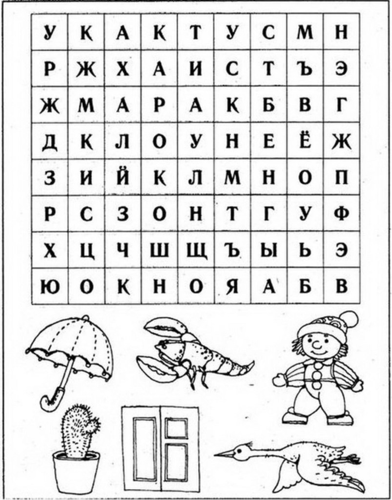 На каждой страничке ребенку нужно найти в таблице слова – названия картинок, изображенных внизу, и прочитать их. Слова расположены по горизонтали.