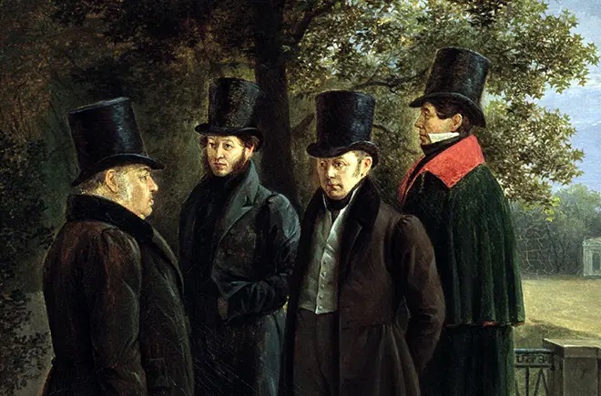 Пушкин, Крылов, Жуковский и Гнедич в Летнем саду. 1832. Масло. Художник Григорий Григорьевич Чернецов